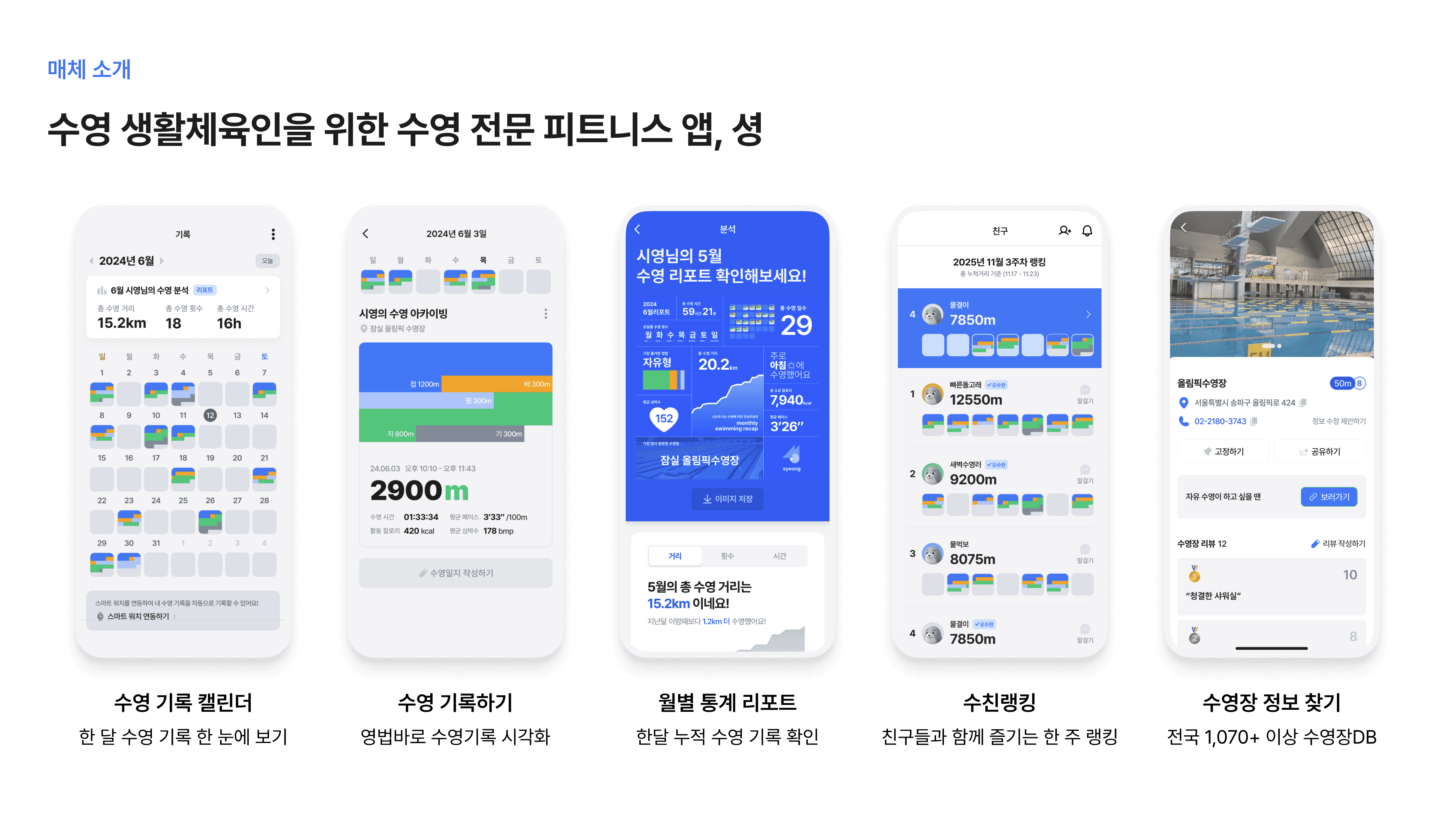 셩은 2023년 3월 런칭하여 6만 명의 수영인이 다운로드한 글로벌 수영 피트니스 앱 서비스입니다. 스마트워치를 통해 수영 기록을 관리하는 수영인을 주요 타겟으로 하며, 유저의 100%가 수영 생활체육인들로 구성되어 있습니다. 앱스토어(iOS), 플레이스토어(Android)에서 직접 다운받으실 수 있으며, 공식 홈페이지를 접속하시면 자세한 앱 소개를 확인하실 수 있습니다.