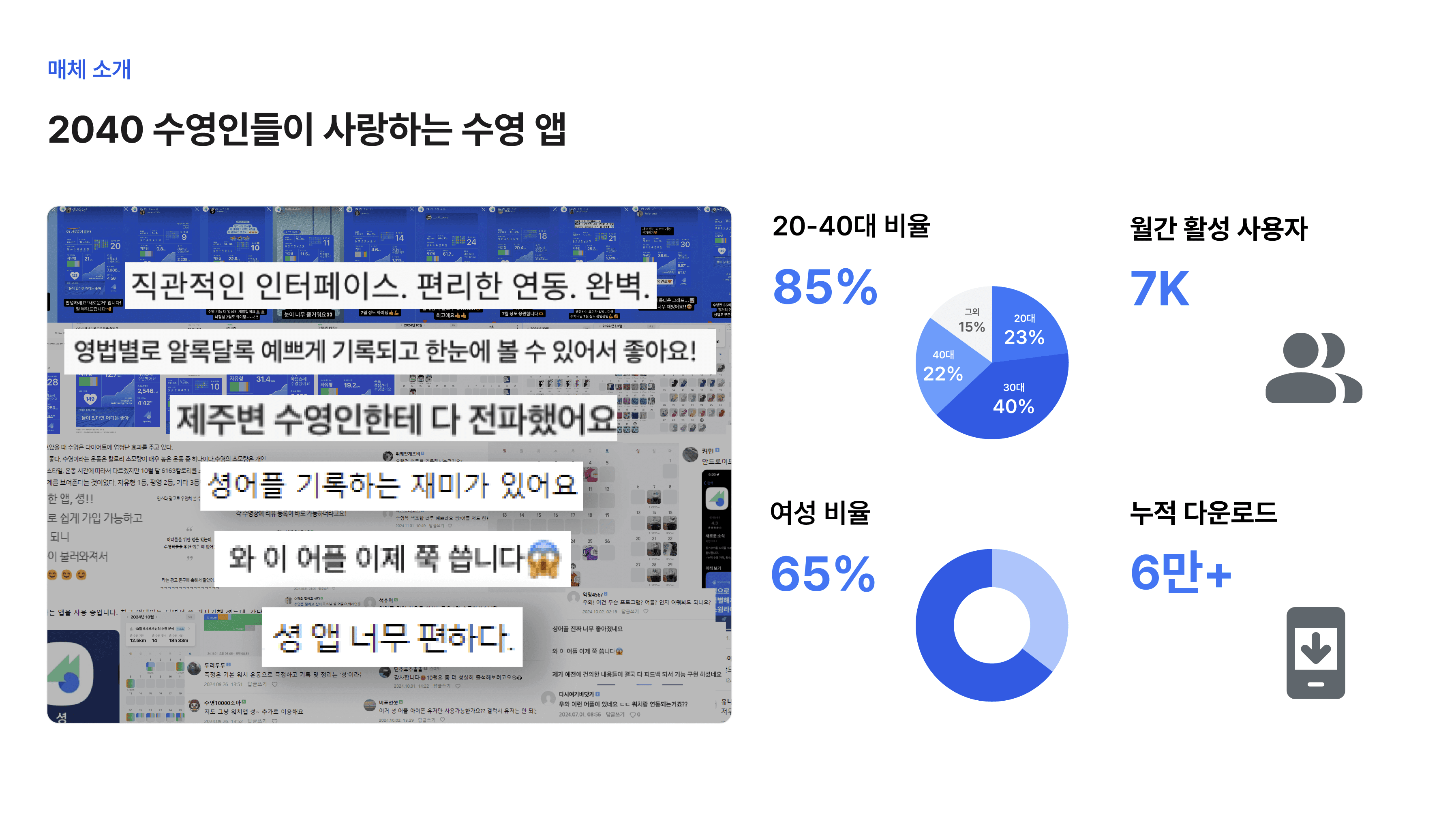 셩은 수영 기록을 남기고 관리하는 유저들이 모여있는 서비스입니다. 그렇기에 타겟 밀도가 압도적으로 높고, 구매력 있는 2040 세대가 전체의 85%를 차지합니다.