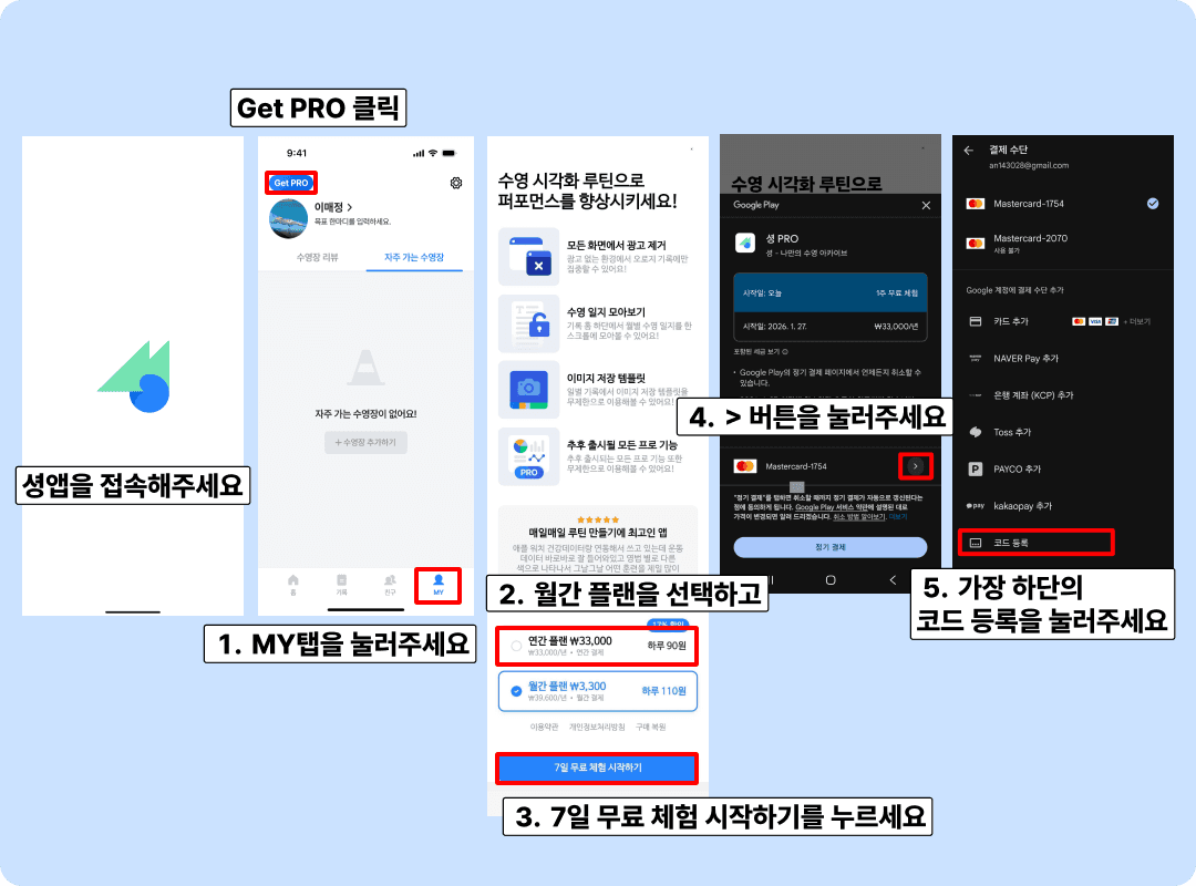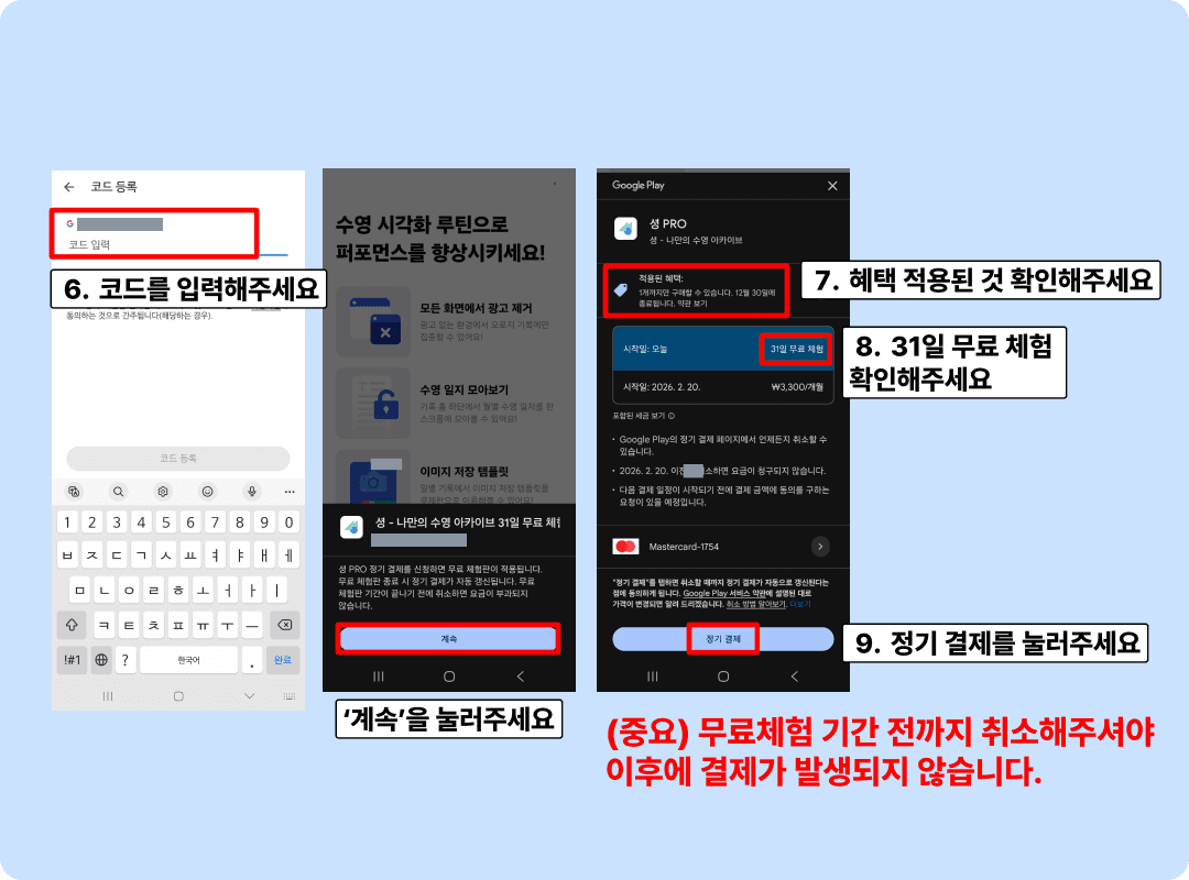 (중요) 안드로이드 정책 상, 정기 결제가 자동으로 등록됩니다. 무료 체험 기간 전까지 취소해주셔야 이후에 결제가 발생하지 않으니 반드시 유의해주세요!