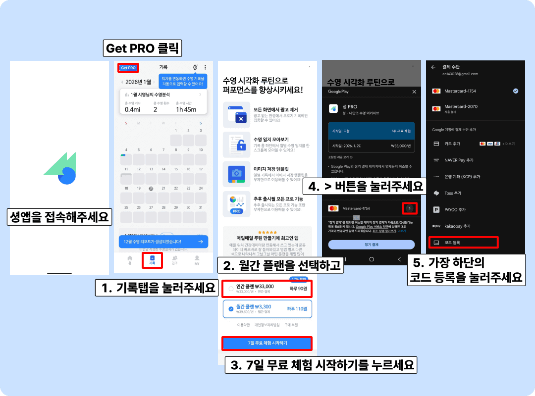 셩 앱 화면 하단 메뉴에서 [기록] 탭을 누른 뒤, 상단에 있는 [Get PRO] 버튼을 선택합니다.