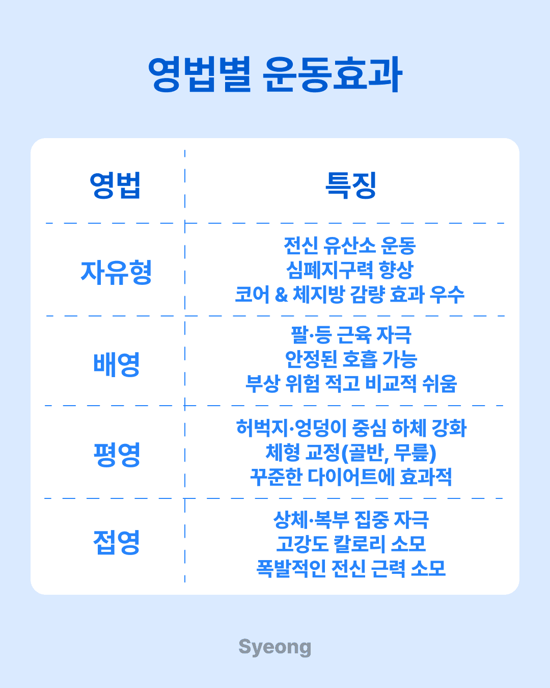 일반적으로 자유형은 효율적인 전신 운동, 평영은 하체 강화,