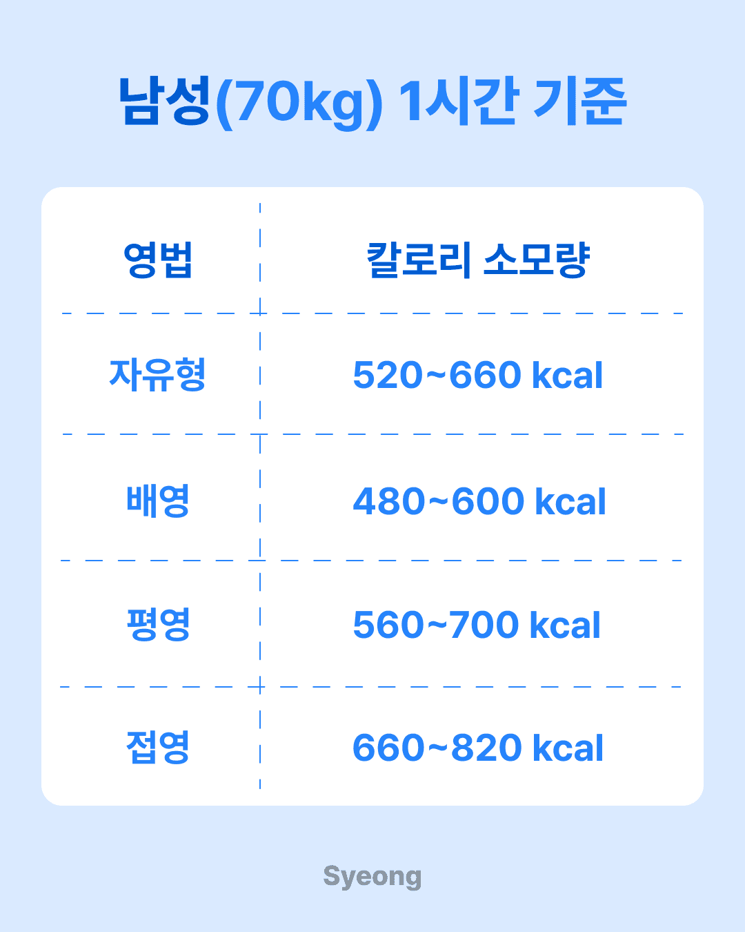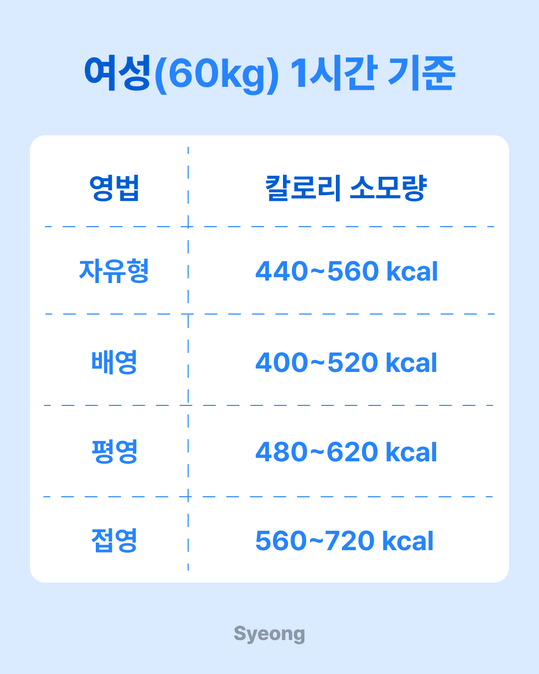 이러한 생체역학적 차이로 인해, 영법에 따라 칼로리 차이가 다르답니다.
