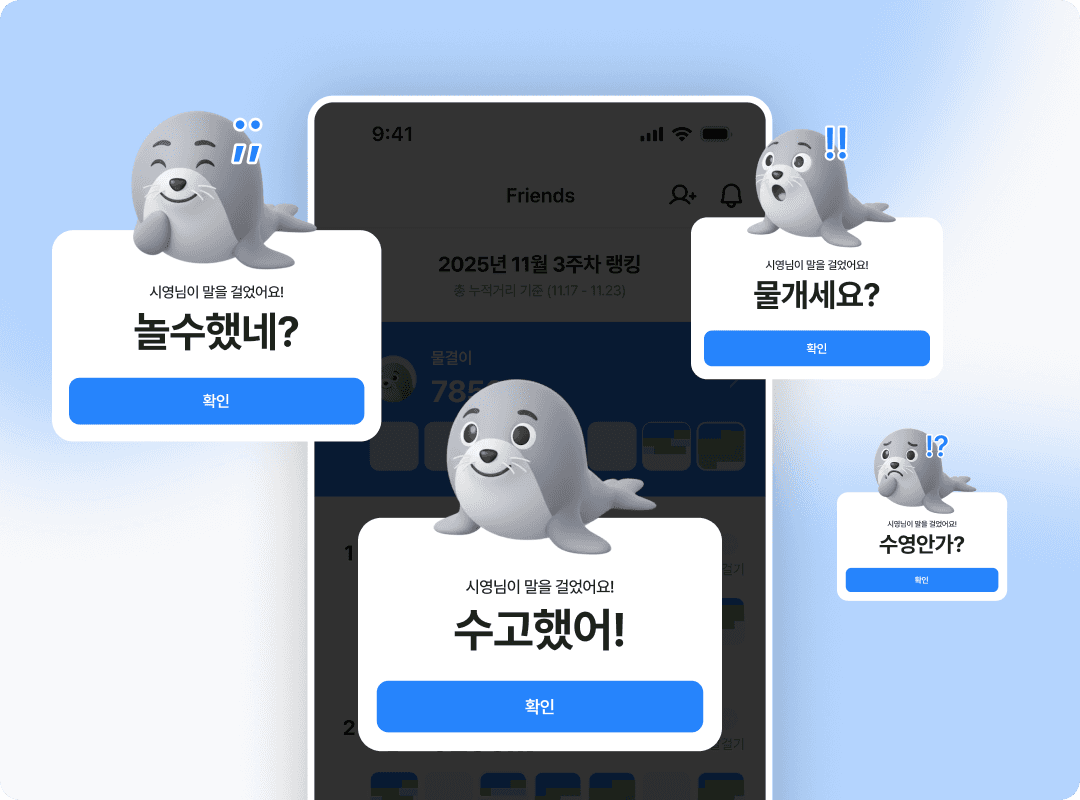 친구에게 귀여운 물개 이모티콘과 함께 말을 걸 수 있어요.