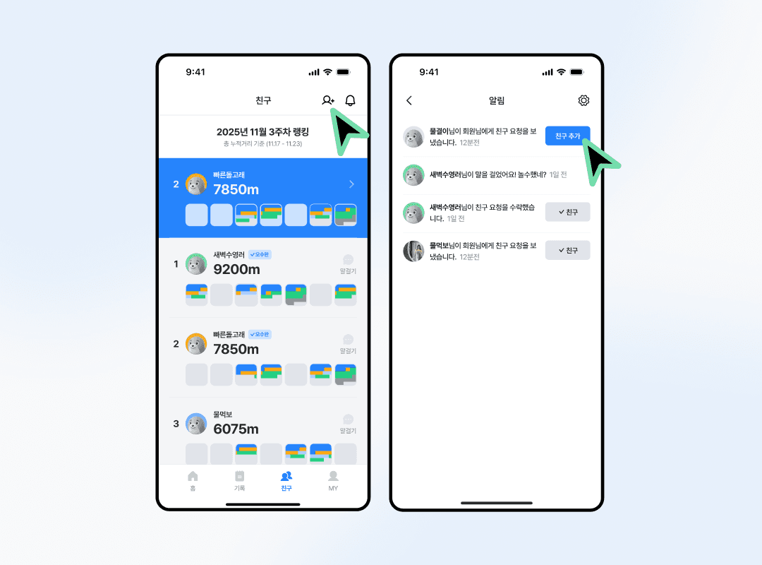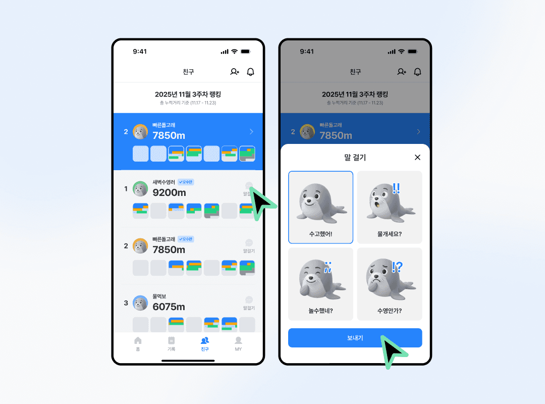 이제 셩에서도 수영 친구를 맺고 서로 응원할 수 있어요.