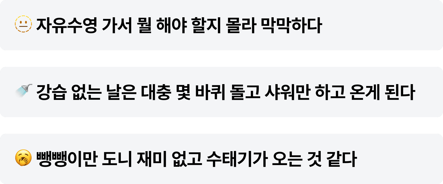 자유수영으로 혼자 레인을 돌다 보면 다음은 어떤 영법을 가야할지, 운동량은 얼만큼 해야할지 막막했을 수영인을 위해 고민했습니다.