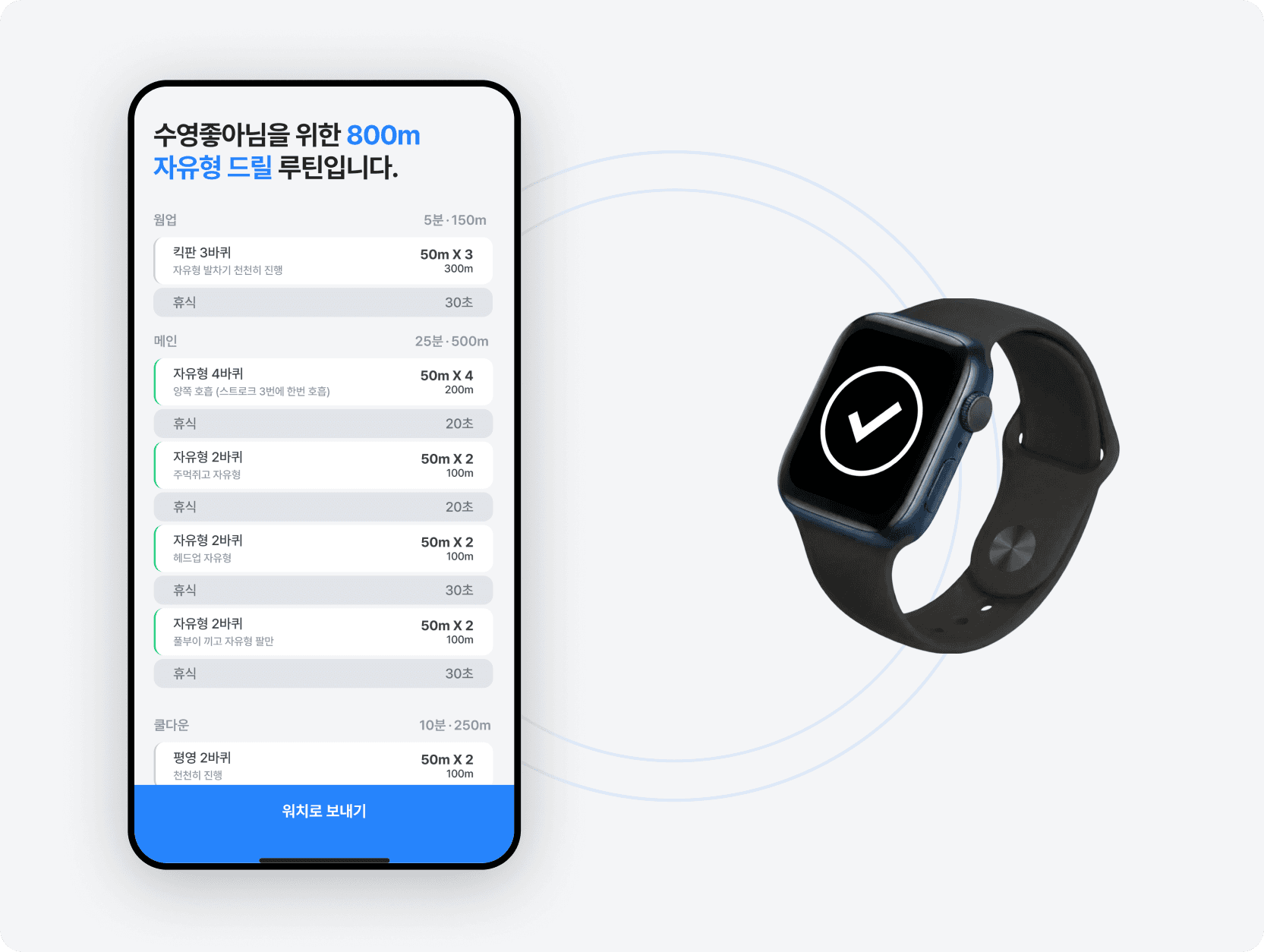 나만을 위해 생성된 루틴은 스마트워치로 연동되고, 수영장에서 실시간으로 수영 가이드를 받을 수 있어요.