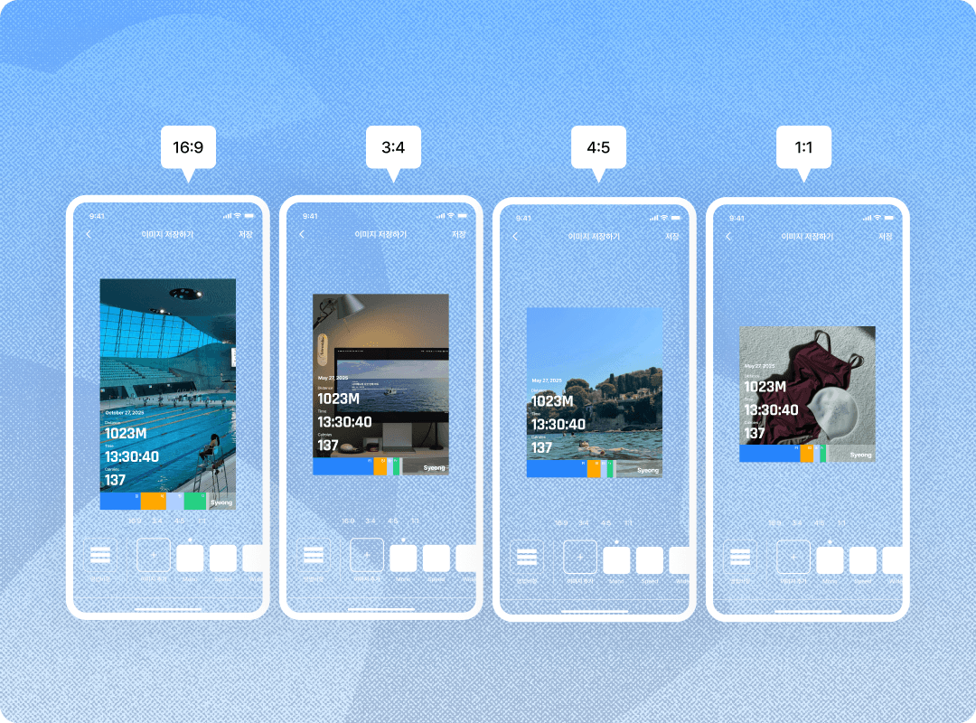 셩은 여러 스타일과 비율을 지원해 누구나 손쉽게 나만의 수영 기록 이미지를 만들 수 있습니다.
